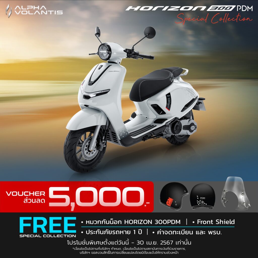 HORIZON300 PDM : Special Collection เป็นรุ่นพิเศษที่ถูกออกแบบมาให้มีความโมเดิร์นทันสมัย ที่เกิดจากความร่วมมือระหว่างแบรนด์ Product Lifestyle ชั้นนำอย่าง PDM และ ALPHA VOLANTIS  โดยทาง PDM ได้นำลวดลาย Stride ดีไซน์อันเป็นเอกลักษณ์ในตำนานของแบรนด์ PDM มาใช้ในการออกแบบและปรับการจัดวางรายละเอียดแต่ละชิ้นให้กระจายตัวไปบนตัวรถ ในรูปแบบการเคลื่อนไหวที่ไร้แรงโน้มถ่วง (Gravity) เสมือนกับการขับเคลื่อนที่ไร้ขีดจำกัดไปได้ในทุกที่ โดยลวดลาย gravity ได้ถูกวางลงบนตัวรถ Alpha Volantis Horizon300 แต่ละจุดอย่างลงตัว ผสานเข้ากับเส้นสายของตัวรถ ดูโดดเด่นในทุกมิติ  สอดรับกับตัวเบาะลวดลายพิเศษที่สะท้อนตัวตนของแบรนด์ PDM และ ALPHA VOLANTIS ได้เป็นอย่างดี