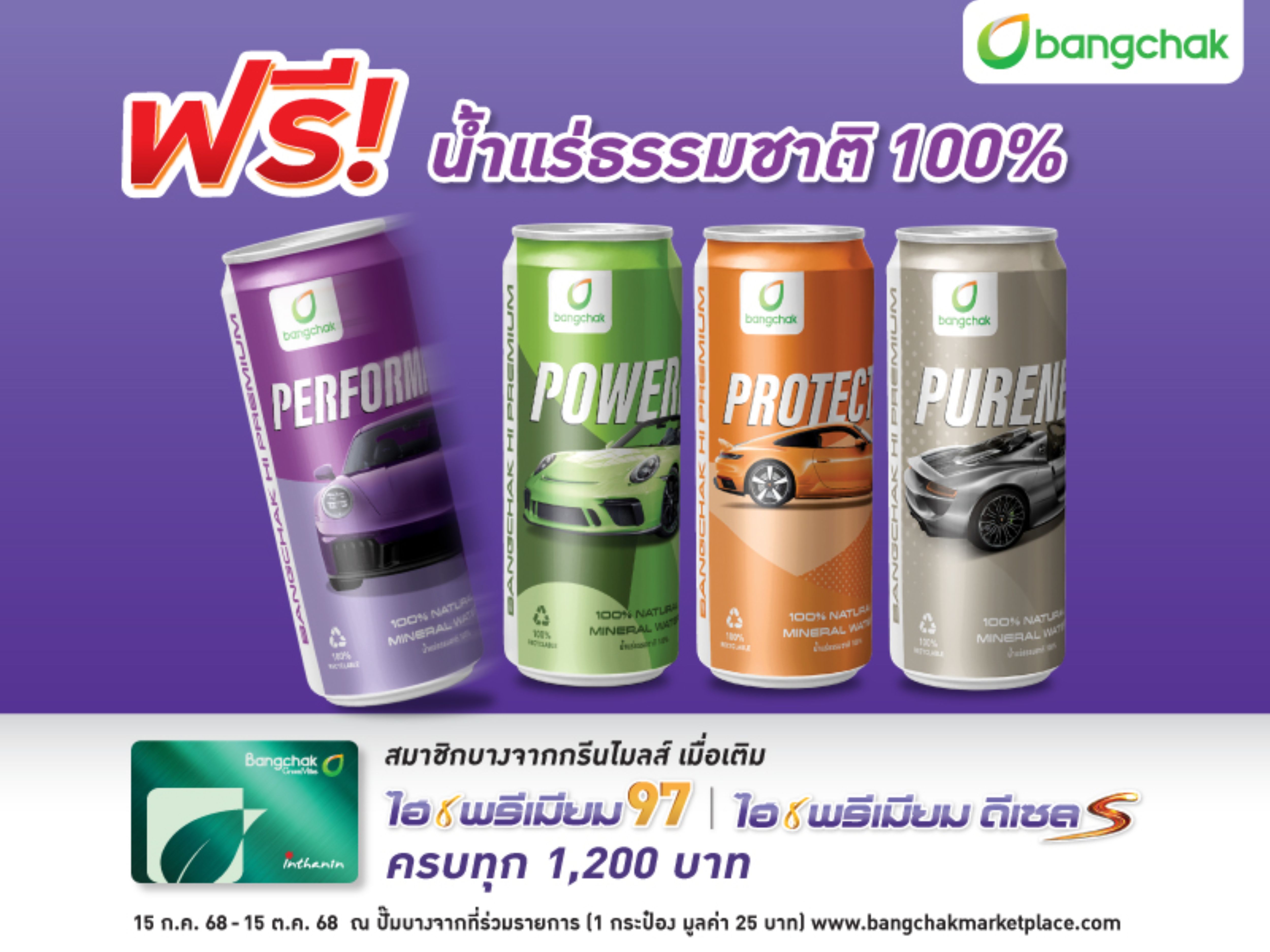 บริษัท บางจาก คอร์ปอเรชั่น จำกัด (มหาชน) จัดสมนาคุณสมาชิกบางจากกรีนไมลส์ เมื่อเติมน้ำมันกลุ่มไฮพรีเมียม ได้แก่ บางจากไฮพรีเมียม 97 หรือ บางจากไฮพรีเมียมดีเซล S ครบทุก 1,200 บาท รับฟรี น้ำแร่ธรรมชาติ 100% บรรจุกระป๋องลิมิเต็ดคอลเลกชัน จำนวน 1 กระป๋อง มูลค่า 25 บาท มีทั้งหมด 4 ลวดลายน่าสะสม ตั้งแต่ 15 กรกฎาคม 2568 ถึง 15 ตุลาคม 2568 ณ สถานีบริการน้ำมันบางจากทั่วประเทศที่ร่วมรายการ พิเศษ! รับเพิ่ม ส่วนลดลิตรละ 3 บาท ทุกวันจันทร์จนถึงวันจันทร์ที่ 29 กันยายน 2568 ดูรายละเอียดเพิ่มเติมได้ที่ www.bangchakmarketplace.com