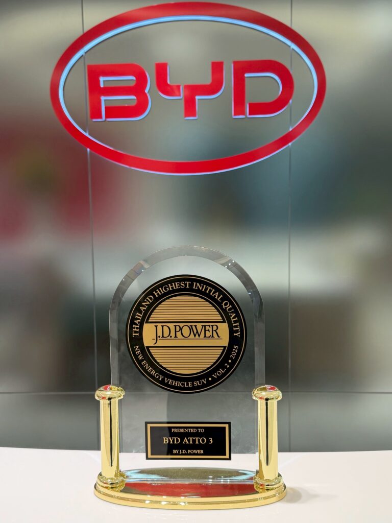 บริษัท บีวายดี ออโต้ (ประเทศไทย) จำกัด ได้รับเกียรติจากบริษัท เจ.ดี. พาวเวอร์ (J.D. Power) ในการมอบรางวัล Initial Quality Study (IQS) สำหรับรถยนต์พลังงานใหม่ (New Energy Vehicle Segment) หลัง BYD ATTO 3 ครองอันดับสูงสุด ในกลุ่มรถยนต์พลังงานใหม่แบบ SUV (NEV SUV) ด้วยคะแนน 149 PP100 ตามผลการศึกษาคุณภาพรถยนต์ใหม่ในประเทศไทย ประจำปี 2568 หรือ J.D. Power 2025 Thailand Initial Quality StudySM (IQS) สะท้อนถึงมาตรฐานการผลิตและคุณภาพระดับชั้นนำ โดยพิธีมอบรางวัลมี นายหยู่ปิน เคอ ผู้จัดการทั่วไป บริษัท บีวายดี ออโต้ (ประเทศไทย) จำกัด เป็นตัวแทนบริษัทฯ รับมอบรางวัลจาก นายอัตสึชิ คาวาฮาชิ ผู้อำนวยการอาวุโส เจ.ดี. พาวเวอร์ ประเทศญี่ปุ่น