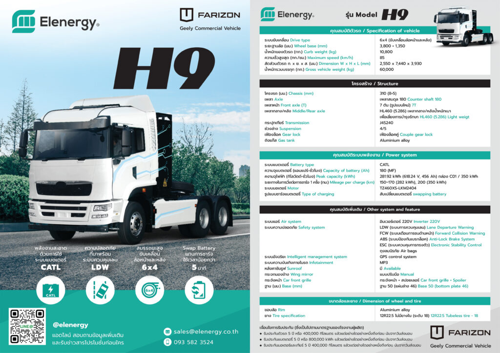 ผู้สนใจสามารถติดต่อสอบถามข้อมูลเพิ่มเติมเกี่ยวกับ Farizon H9 Electric Prime Mover และระบบสลับแบตเตอรี่ (Battery Swapping Station) ได้ที่ บริษัท เอลเอเนอร์จี้ จำกัด Line Official: @elenergy หรือเยี่ยมชมเว็บไซต์ www.elenergy.co.th