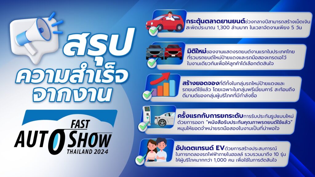 รวบตึงงาน “ฟาสต์ ออโต โชว์ ไทยแลนด์ 2024” (FAST Auto Show Thailand 2024) ปิดฉากปีที่ 12ด้วยความสำเร็จตามเป้าหมายในการกระตุ้นตลาดยานยนต์ไทยช่วงโลว์ซีซั่นกลางปีครบทุกหมวด ทั้ง “รถใหม่ป้ายแดง รถไฟฟ้ามีให้ลอง รถมือสองมีรับประกัน” กวาดเม็ดเงินสะพัดกว่า 1,300 ล้านบาทในช่วงจัดงานเพียง 5 วัน จากความหลากหลายให้เลือกได้ทั้งรถใหม่และรถใช้แล้วเกรดเอ รวมถึงการรับประกันซื้อคืน 100% สำหรับรถมือสองที่ซื้อในงาน ยืนหยัดพร้อมหนุนตลาดรถกลางปีหน้า แปะมือส่งต่อให้ 2 พันธมิตรหลักที่ร่วมจัดงานครั้งนี้ ทั้งสื่อสากล ผู้จัดงานมอเตอร์เอ็กซ์โป และกรังด์ปรีซ์ ผู้จัดงานมอเตอร์โชว์  ช่วยกันพลิกฟื้นภาคยานยนต์ของไทยต่อไปในช่วงปลายปีนี้และต้นปีหน้า