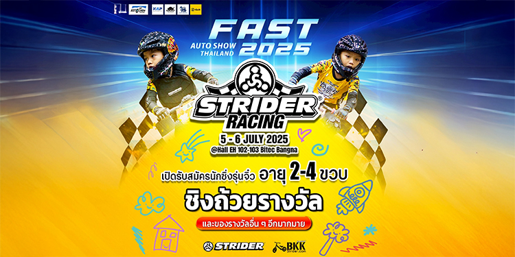 พร้อมขอฝากกิจกรรมสำหรับนักซิ่งฟันน้ำนม กับการแข่งขันจักรยานขาไถ “Strider Racing @Fast Auto Show Thailand 2025” บนสนามแข่งมาตรฐาน สำหรับเยาวชนอายุ 2 – 4 ปี จัดแข่ง 2 รุ่น คือ รุ่น Enjoy และรุ่น Racing รวม 14 รุ่น เพื่อชิงถ้วยและเหรียญรางวัล ในวันเสาร์ที่ 5 และวันอาทิตย์ที่ 6 กรกฎาคม สมัครออนไลน์ได้ถึงวันที่ 30 มิถุนายน ศกนี้ ติดตามรายละเอียดได้ที่  https://form.jotform.com/251512312965453 หรือสมัครหน้างานในวันแข่งขัน