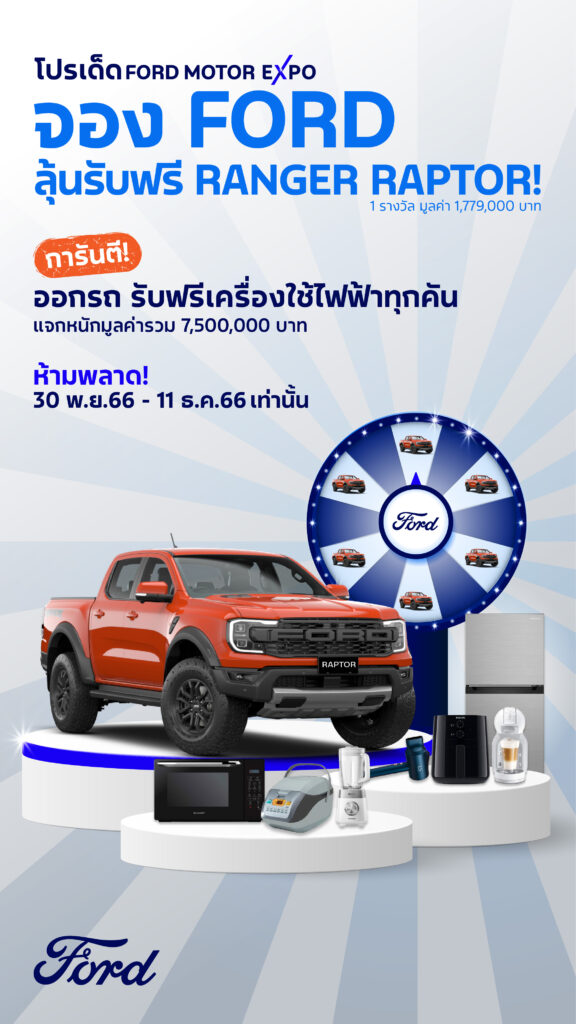 ฟอร์ด ประเทศไทย อัดโปรแรงท้ายปีต่อยอดความดุดันไปอีกขั้น เมื่อจองรถฟอร์ดรุ่นใดก็ได้ตั้งแต่วันที่ 30 พฤศจิกายน ถึง 11 ธันวาคม 2566 และออกรถภายในวันที่ 30 ธันวาคม 2566 มีสิทธิ์ลุ้นรับรถฟอร์ด เรนเจอร์ แร็พเตอร์ รุ่น 2.0 ลิตร จำนวน 1 รางวัล มูลค่า 1,779,000 บาท โดยเมื่อจอง 1 คัน จะได้รับ 1 สิทธิ์ลุ้น พร้อมรับทันทีเครื่องใช้ไฟฟ้า 1 ชิ้น โดยการจอง 1 คัน จะได้รับเครื่องใช้ไฟฟ้า 1 ชิ้น รวมมูลค่าของรางวัลในแคมเปญถึง 7,500,000 บาท ในงานมอเตอร์ เอ็กซ์โป 2023 และที่ผู้จำหน่ายอย่างเป็นทางการของฟอร์ดทั่วประเทศ