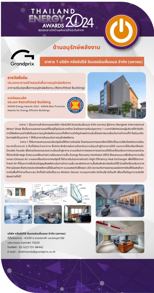 บริษัท กรังด์ปรีซ์ อินเตอร์เนชั่นแนล จำกัด (มหาชน) โดย นายพีระพงศ์ เอี่ยมลำเนา ประธานเจ้าหน้าที่บริหาร เข้ารับรางวัลดีเด่น ประเภทอาคารสร้างสรรค์เพื่อการอนุรักษ์พลังงาน สาขา อาคารปรับปรุงเพื่อการอนุรักษ์พลังงาน (Retrofitted Building)ซึ่งถือเป็นอีกหนึ่งรางวัลอันทรงเกียรติ ในงาน “Thailand Energy Awards 2024” จัดโดยกรมพัฒนาพลังงานทดแทนและอนุรักษ์พลังงาน (พพ.) กระทรวงพลังงาน โดยได้รับเกียรติจาก นายอรรถพล ฤกษ์พิบูลย์ รัฐมนตรีว่าการกระทรวงพลังงาน เป็นประธานในพิธีมอบรางวัล ณ ห้องแซฟไฟร์ 202 อาคารอิมแพ็ค ฟอรั่ม ชั้น 2 อิมแพ็ค เมืองทองธานี เมื่อวันอังคารที่ 23 ธันวาคม 2568 ที่ผ่านมา
