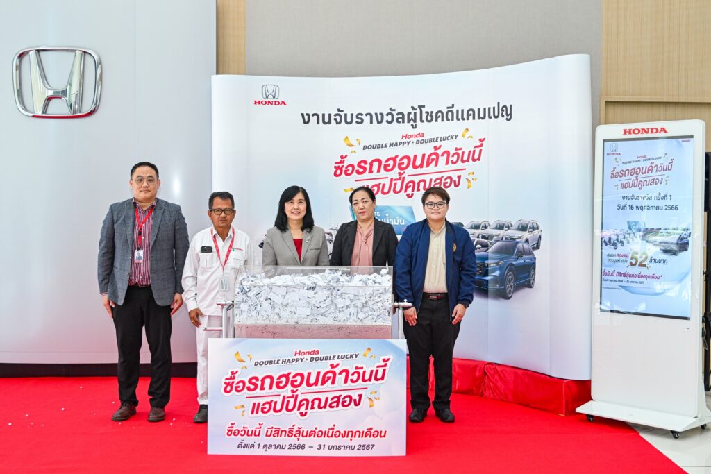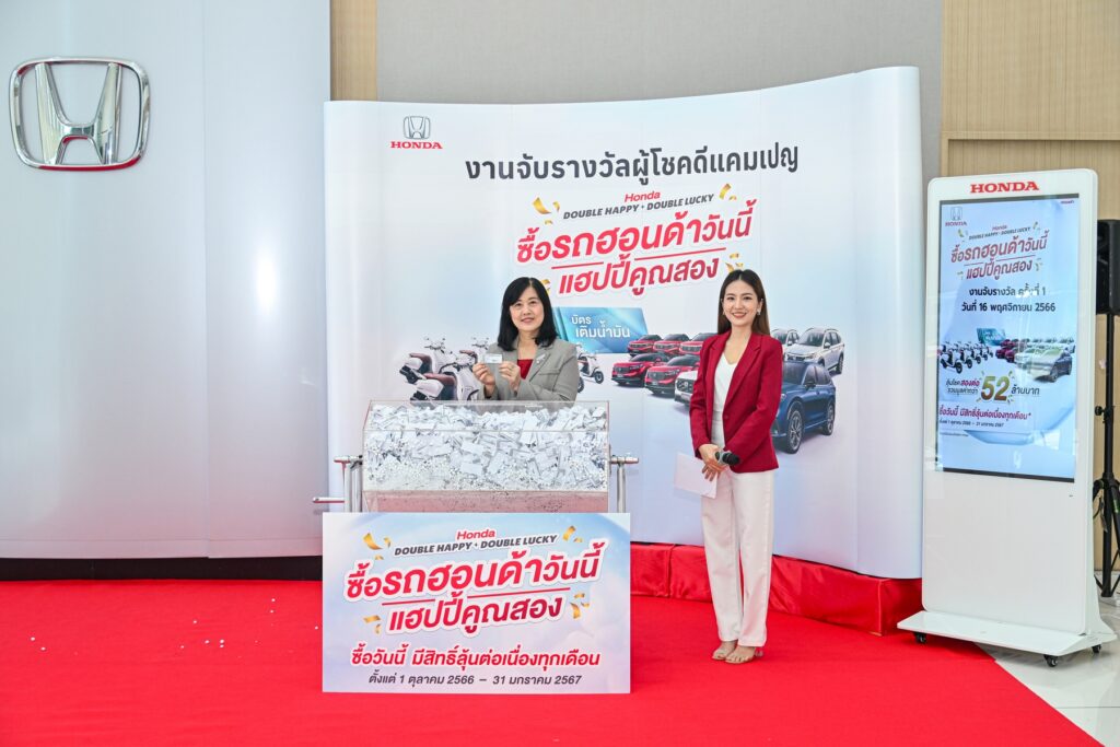 บริษัท ฮอนด้า ออโตโมบิล (ประเทศไทย) จำกัด ได้ทำการจับและมอบรางวัลให้แก่ผู้โชคดี จากแคมเปญ “Honda Double Happy, Double Lucky ซื้อรถฮอนด้าวันนี้ แฮปปี้คูณสอง” ให้ลูกค้าที่ซื้อและรับรถยนต์ฮอนด้ารุ่นใดก็ได้ ตั้งแต่วันที่ 1 ตุลาคม 2566 – 31 มกราคม 2567 โดยลูกค้าจะได้รับ 1 สิทธิ์ต่อการซื้อรถยนต์ 1 คัน เพื่อลุ้นรับรางวัล 2 ต่อ ยิ่งซื้อรถเร็ว ยิ่งมีสิทธิ์ลุ้นต่อเนื่องมากกว่า โดยต่อที่ 1 ลุ้นรับบัตรน้ำมันมูลค่า 20,000 บาท หรือ 10,000 บาท โดยมีจำนวนเพิ่มขึ้นในทุกเดือน รวม 3,000 รางวัล หากลูกค้ายังไม่ได้รับโชคในครั้งแรก ลูกค้าจะสามารถลุ้นได้ใหม่ทุกเดือนตลอดแคมเปญ และต่อที่ 2 ลูกค้าทุกคนมีสิทธิ์ลุ้นรางวัลใหญ่