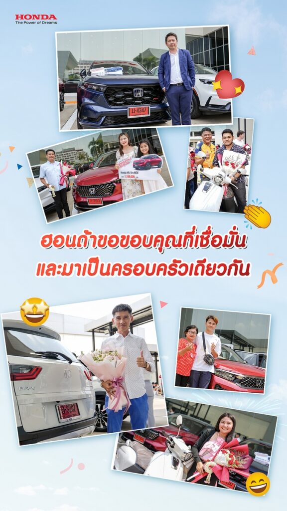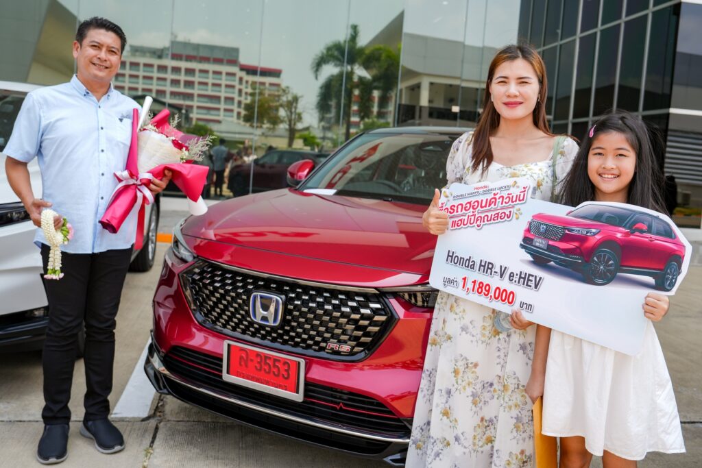 ) เพื่อเป็นการขอบคุณในความเชื่อมั่นและไว้วางใจของลูกค้าที่มีต่อแบรนด์ฮอนด้า บริษัท ฮอนด้า ออโตโมบิล (ประเทศไทย) จำกัด นำโดย นายฮิเดโอะ คาวาซากะ ประธานกรรมการบริหารและซีอีโอ พร้อมด้วย คุณอารีย์ สุชนลิมะกุล ผู้จัดการทั่วไปส่วนการขายและส่วนบริการหลังการขาย ส่งมอบรางวัลใหญ่รถยนต์ฮอนด้าในไลน์อัปเอสยูวี 4 รุ่น นำโดย รถยนต์ฮอนด้ารุ่น ซีอาร์-วี เกรด e:HEV RS 4WD สีน้ำเงินแคนยอนริเวอร์ (เมทัลลิก) จำนวน 1 คัน รถยนต์ฮอนด้ารุ่น ซีอาร์-วี เกรด EL 4WD สีขาวแพลทินัม (มุก) จำนวน 1 คัน รถยนต์ฮอนด้ารุ่น เอชอาร์-วี อี:เอชอีวี เกรด e:HEV RS สีแดงอิกไนต์ (เมทัลลิก) หลังคาสีดำ (ทูโทน) จำนวน 2 คัน รถยนต์ฮอนด้ารุ่น บีอาร์-วี เกรด EL สีขาวพรีเมียมซันไลท์ (มุก) จำนวน 3 คัน รถยนต์ฮอนด้ารุ่น ดับเบิลยูอาร์-วี เกรด RS สีแดงอิกไนต์ (เมทัลลิก) หลังคาสีดำ (ทูโทน) จำนวน 3 คัน พร้อมด้วยรถจักรยานยนต์ฮอนด้า จีออโน่ พลัส (GIORNO+) รุ่น ABS จำนวน 20 คัน รวมทั้งสิ้น 30 รางวัล รวมมูลค่ากว่า 13 ล้านบาท ให้ลูกค้าผู้โชคดีจากแคมเปญ “Honda Double Happy, Double Lucky ซื้อรถฮอนด้าวันนี้ แฮปปี้คูณสอง” ที่ซื้อและรับรถยนต์ฮอนด้าตั้งแต่วันที่ 1 ตุลาคม 2566 – 31 มกราคม 2567 ณ บริษัท ฮอนด้า ออโตโมบิล (ประเทศไทย) จำกัด ส่วนการขายและบริการ และศูนย์ฝึกอบรม เมื่อวันอังคารที่ 9 เมษายน 2657 ที่ผ่านมานี้