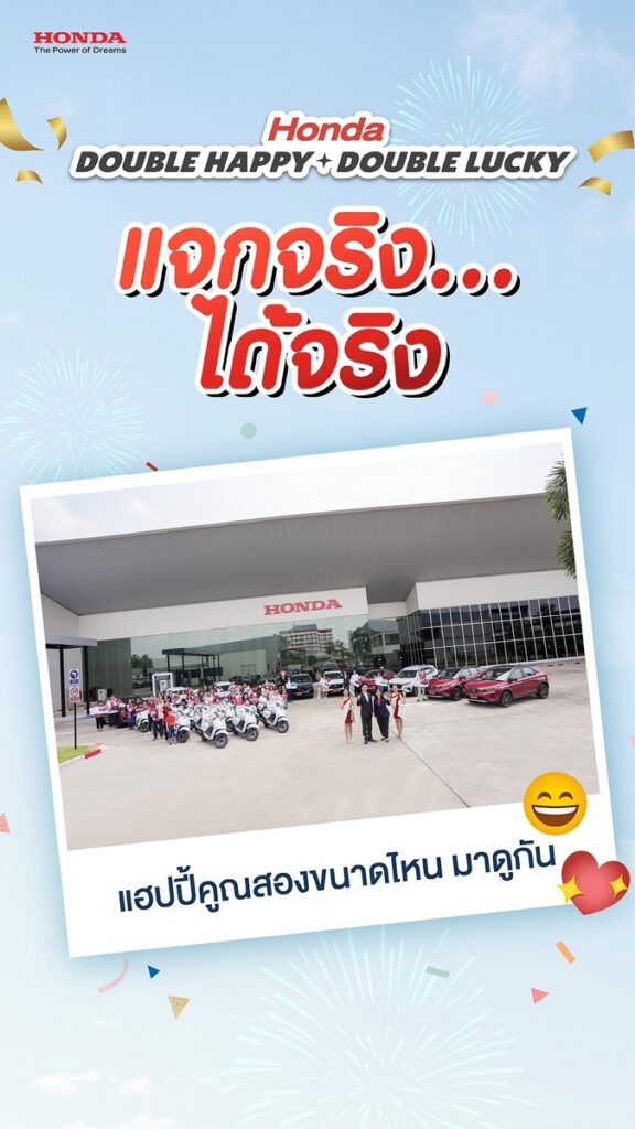 สามารถเช็กรายชื่อลูกค้าผู้โชคดีทั้ง 30 ท่าน ในแคมเปญ “Honda Double Happy, Double Lucky ซื้อรถฮอนด้าวันนี้ แฮปปี้คูณสอง” ได้ทาง https://www.honda.co.th/promotions/detail/hondadoublehappydoublelucky และสามารถสอบถามข้อมูลเพิ่มเติมได้จากที่ปรึกษาการขายโชว์รูมฮอนด้าทั่วประเทศ หรือแชตกับที่ปรึกษาการขายทางออนไลน์ผ่านเว็บไซต์ www.honda.co.th หรือติดต่อศูนย์บริการข้อมูลฮอนด้า 24 ชั่วโมง โทร 0 2341 7777 โดยสามารถลงทะเบียนร่วมกิจกรรมทดลองขับที่โชว์รูมฮอนด้าผ่าน www.honda.co.th/testdrive ตั้งแต่วันที่ 7 กุมภาพันธ์ 2567 ถึง 30 เมษายน 2567 จะได้รับฟรี Happy Puffy Bag มูลค่า 250 บาท*