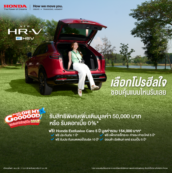 บริษัท ฮอนด้า ออโตโมบิล (ประเทศไทย) จำกัด จัดโปรแรงส่งท้ายปีกับแคมเปญ “Honda Pro OH! MY GOOOOOD PLUS+” เพิ่มเติมทางเลือกใหม่สำหรับรถยนต์สองรุ่นฮิตในไลน์อัป Honda e:HEV – The EXCITING Hybrid ทั้ง Honda Civic e:HEV และNew Honda HR-V e:HEV มอบความคุ้มค่าที่ “ตรงใจ เลือกได้เอง” ให้คุณเลือกได้ดั่งใจรับสิทธิพิเศษเพิ่มเติมมูลค่า 50,000 บาท หรือ เลือกรับดอกเบี้ยพิเศษ 0% พร้อมรับ Honda Exclusive Care 5 ปี มูลค่าสูงสุด 173,000 บาท** ให้การเป็นเจ้าของรถยนต์ทั้งสองรุ่นเป็นเรื่องง่ายกว่าที่เคย สำหรับลูกค้าที่จองรถยนต์ตั้งแต่วันที่ 1 พฤศจิกายน 2568 – 11 ธันวาคม 2568 และรับรถภายในวันที่ 31 ธันวาคม 2568 อย่าพลาด! โปรแรงแห่งปีที่ทำให้ความฝันของคุณเป็นจริง