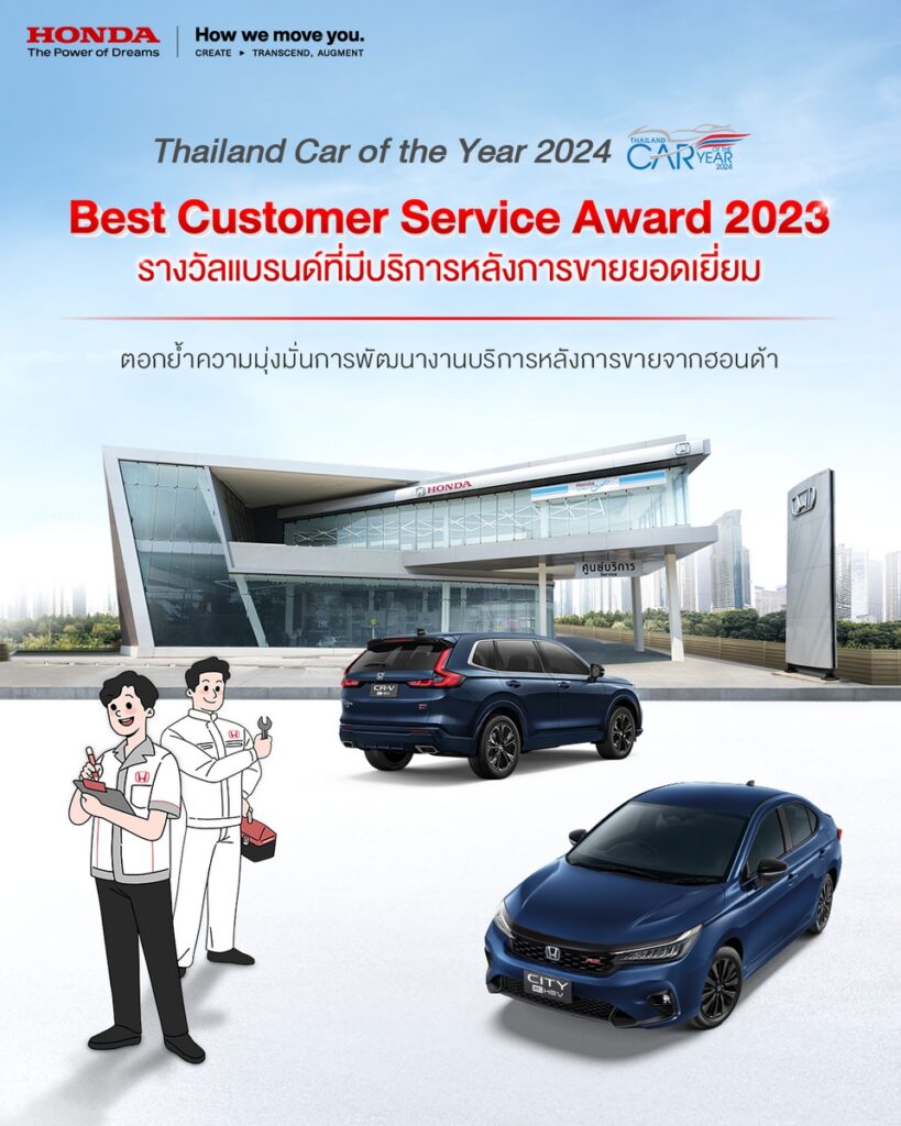 บริษัท ฮอนด้า ออโตโมบิล (ประเทศไทย) จำกัด คว้ารางวัล ‘แบรนด์ที่มีบริการหลังการขายยอดเยี่ยม (BEST CUSTOMER SERVICE 2023)’ จากกิจกรรมการแข่งขันทักษะพนักงานฮอนด้าประจำปี 2566 (Honda Skill Contest 2023) ในงานมอบรางวัลรถยนต์ยอดเยี่ยมประจำปี 2567 (Thailand Car of the Year 2024) ที่จัดโดยสมาคมผู้สื่อข่าวรถยนต์และรถจักรยานยนต์ไทย (สรยท.) ตอกย้ำว่าฮอนด้าไม่เพียงแค่เป็นแบรนด์รถยนต์ที่มุ่งมั่นในการนำเสนอยนตรกรรมคุณภาพที่ตอบโจทย์ไลฟ์สไตล์อันหลากหลายของลูกค้า แต่ยังให้ความสำคัญด้านการบริการหลังการขายที่ครบวงจรผ่านเครือข่ายศูนย์บริการ 219 แห่งที่ครอบคลุมทั่วประเทศควบคู่กันไปด้วย เพื่อส่งมอบการดูแลและการบริการที่มีคุณภาพผ่านผู้เชี่ยวชาญในทุกด้าน ให้ลูกค้าอุ่นใจและมีประสบการณ์ที่ดีตลอดอายุการใช้งานรถยนต์