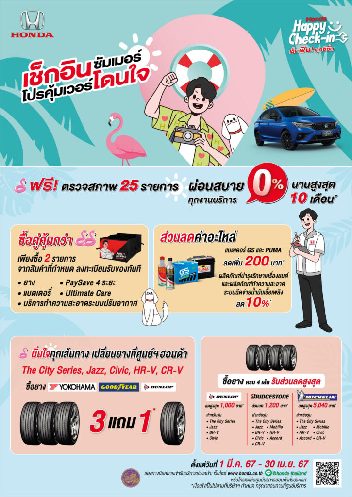 บริษัท ฮอนด้า ออโตโมบิล (ประเทศไทย) จำกัด ร่วมกับกรมการขนส่งทางบก จัดแคมเปญ “เช็กอินซัมเมอร์ โปรคุ้มเว่อร์โดนใจ” เชิญชวนลูกค้าฮอนด้าเตรียมความพร้อมทุกการเดินทางช่วงฤดูร้อนและเทศกาลสงกรานต์ ด้วยบริการตรวจสภาพรถยนต์ฟรี 25 รายการ พร้อมข้อเสนอสุดพิเศษ อาทิ ส่วนลด 10% ผลิตภัณฑ์บำรุงรักษาเครื่องยนต์และผลิตภัณฑ์ทำความสะอาดระบบฉีดจ่ายน้ำมันเชื้อเพลิง พร้อมด้วยแคมเปญยางรถยนต์หลากหลายยี่ห้อ อาทิ ซื้อ 3 แถม 1 หรือซื้อครบ 4 เส้น รับส่วนลดพิเศษ บัตรเติมน้ำมันหรือบัตรโลตัส รวมถึงมอบสิทธิประโยชน์พิเศษต่าง ๆ ซึ่งครอบคลุมทั้งลูกค้าใหม่และลูกค้าเก่า โดยมีระยะแคมเปญตั้งแต่วันที่ 1 มีนาคม 2567 – 30 เมษายน 2567
