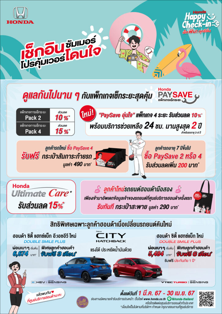 - ลูกค้ารถยนต์ฮอนด้าใหม่ เมื่อซื้อแพ็กเกจเช็กระยะฮอนด้าเพย์เซฟแบบ 4 ระยะ ภายในวันส่งมอบรถใหม่ หรือภายใน 30 วันหลังส่งมอบรถใหม่ คุ้มสุดกับส่วนลดค่าแรงค่าอะไหล่ 15% พร้อมรับฟรี กระเป๋าเก็บสัมภาระท้ายรถ “Honda Happy Check-in” มูลค่า 490 บาท