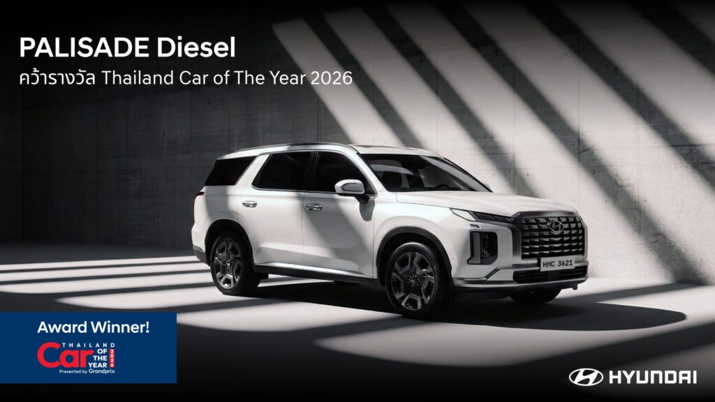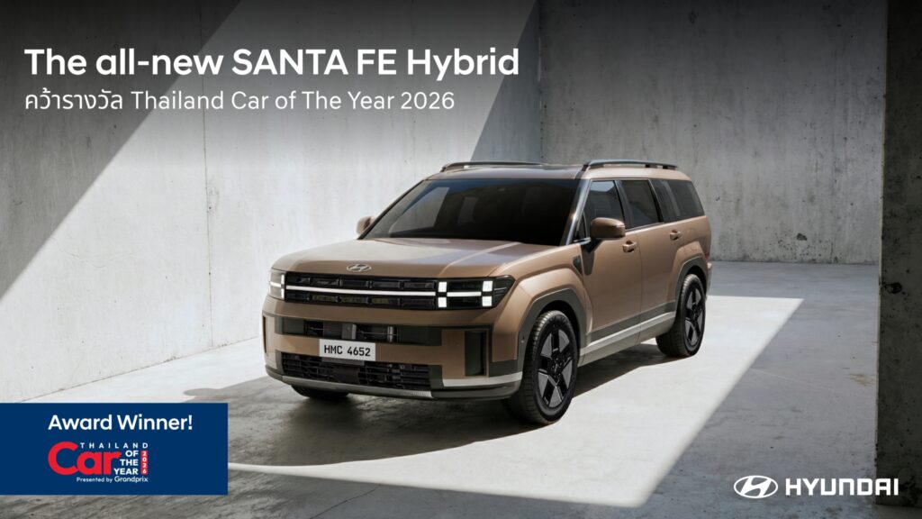 บริษัท ฮุนได โมบิลิตี้ (ประเทศไทย) จำกัด ประกาศความสำเร็จรับต้นปี 2569 หลังคว้า 2 รางวัลอันทรงเกียรติจากเวทีประกาศรางวัลรถยอดเยี่ยมแห่งปี “CAR & BIKE OF THE YEAR 2026” จัดโดย บริษัท กรังด์ปรีซ์ อินเตอร์เนชั่นแนล จำกัด (มหาชน) สะท้อนความแข็งแกร่งของไลน์อัป SUV โดย Hyundai all-new SANTA FE Hybrid คว้ารางวัล BEST HYBRID MID-SIZE SUV UNDER 1,800 c.c. ขณะที่ Hyundai PALISADE Diesel คว้ารางวัล BEST DIESEL SUV UNDER 2,200 c.c. ตอกย้ำความแข็งแกร่งของแบรนด์ที่พร้อมมอบผลิตภัณฑ์ที่มีคุณภาพยอดเยี่ยมแก่ผู้บริโภคชาวไทย