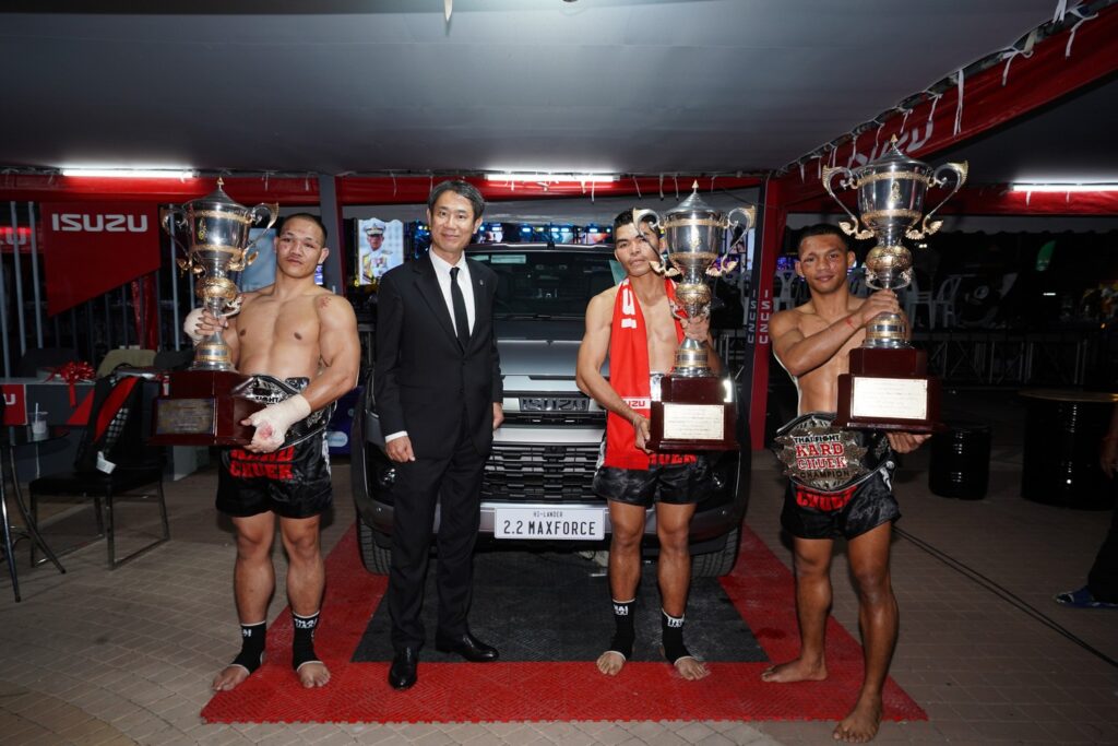 มร. ทาคาชิ ฮาตะ กรรมการผู้จัดการ บริษัท ตรีเพชรอีซูซุเซลส์ จำกัด กล่าวว่า “ขอแสดงความยินดีกับจรวดศึกและเขี้ยวเพชรที่คว้าแชมป์THAI FIGHT 2025มาครองได้อย่างสง่างาม ด้วยหัวใจนักสู้ที่แข็งแกร่งจนได้รับพระราชทานถ้วยรางวัลอันทรงเกียรติ ซึ่งถือเป็นความสำเร็จอันน่าภาคภูมิใจในอาชีพนักชก  ผมขออวยพรให้ทั้งสองท่านประสบความสำเร็จยิ่งขึ้นไปในอนาคต พร้อมกันนี้ ขอขอบคุณผู้ชมทุกท่าน  ที่ให้การสนับสนุนรถอีซูซุรายการ Isuzu Thailand Championship และ THAI FIGHT ด้วยดีเสมอมา  ทุกแรงใจของท่านคือพลังสำคัญที่ขับเคลื่อนให้อีซูซุมุ่งมั่นพัฒนาอย่างไม่หยุดยั้ง และเราหวังเป็นอย่างยิ่งว่า  จะได้รับความไว้วางใจจากทุกท่านเช่นนี้ตลอดไป”