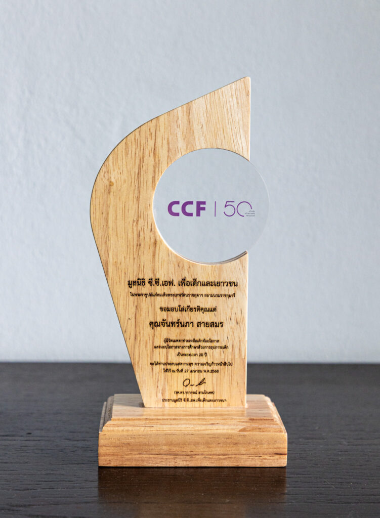 นางสาวจันทร์นภา สายสมร ประธานเจ้าหน้าที่บริหาร บริษัท เทคโนเซล (เฟรย์) จำกัด ผู้นำเข้าและจัดจำหน่ายฟิล์มกรองแสงรถยนต์และอาคารลามิน่า รับมอบโล่เชิดชูเกียรติจาก รองศาสตราจารย์ ดร.วรากรณ์ สามโกเศศ ประธานกรรมการ มูลนิธิ ซี.ซี.เอฟ. เพื่อเด็กและเยาวชน ในพระราชูปถัมภ์สมเด็จพระเทพรัตนราชสุดาฯ สยามบรมราชกุมารี ในฐานะผู้อุปการะมูลนิธิช่วยเหลือเด็กด้อยโอกาสทางการศึกษาเป็นระยะเวลา 20 ปี ในงาน Stream of Giving สายธารแห่งการให้ไม่สิ้นสุด ครบรอบ 50 ปี CCF ณ หอประชุมสถาบันเทคโนโลยีไทย-ญี่ปุ่น