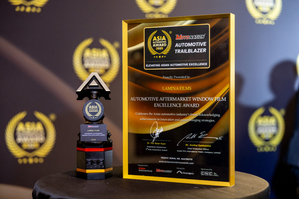 นางสาวจันทร์นภา สายสมร ประธานเจ้าหน้าที่บริหาร บริษัท เทคโนเซล (เฟรย์) จำกัด ผู้นำเข้าและจัดจำหน่ายฟิล์มกรองแสงรถยนต์และอาคาร “ลามิน่า” จากสหรัฐอเมริกา รับรางวัลผลิตภัณฑ์ฟิล์มกรองแสงติดรถยนต์ยอดเยี่ยมระดับเอเชีย Automotive Aftermarket Window Film Excellence Award ในงาน The 5th Asia Automotive Award 2025 – Thailand Chapter เชิดชูสุดยอดยานยนต์เอเชียครั้งแรกในไทย