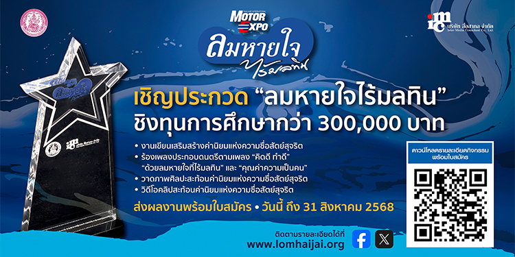 มูลนิธิลมหายใจไร้มลทิน โดยบริษัท สื่อสากล จำกัด ผู้จัดงาน “มหกรรมยานยนต์” ได้รับการสนับสนุนจาก กรมกิจการเด็กและเยาวชน กระทรวงการพัฒนาสังคมและความมั่นคงของมนุษย์ จัดโครงการลมหายใจไร้มลทิน ประจำปี 2568 เพื่อเสริมสร้างค่านิยมแห่งความซื่อสัตย์สุจริตแก่เด็กและเยาวชนทั่วประเทศ ด้วยการเชิญชวนเด็ก และเยาวชนระดับปฐมวัย ถึงอุดมศึกษา ส่งผลงานเข้าประกวด ชิงทุนการศึกษามูลค่ารวมกว่า 300,000 บาท โล่เกียรติคุณ พร้อมเกียรติบัตร และผู้ส่งผลงานทุกประเภทจะได้รับเกียรติบัตร (E-Certificate) โดยแบ่งเป็น 4 ประเภท ได้แก่