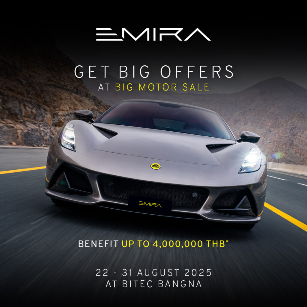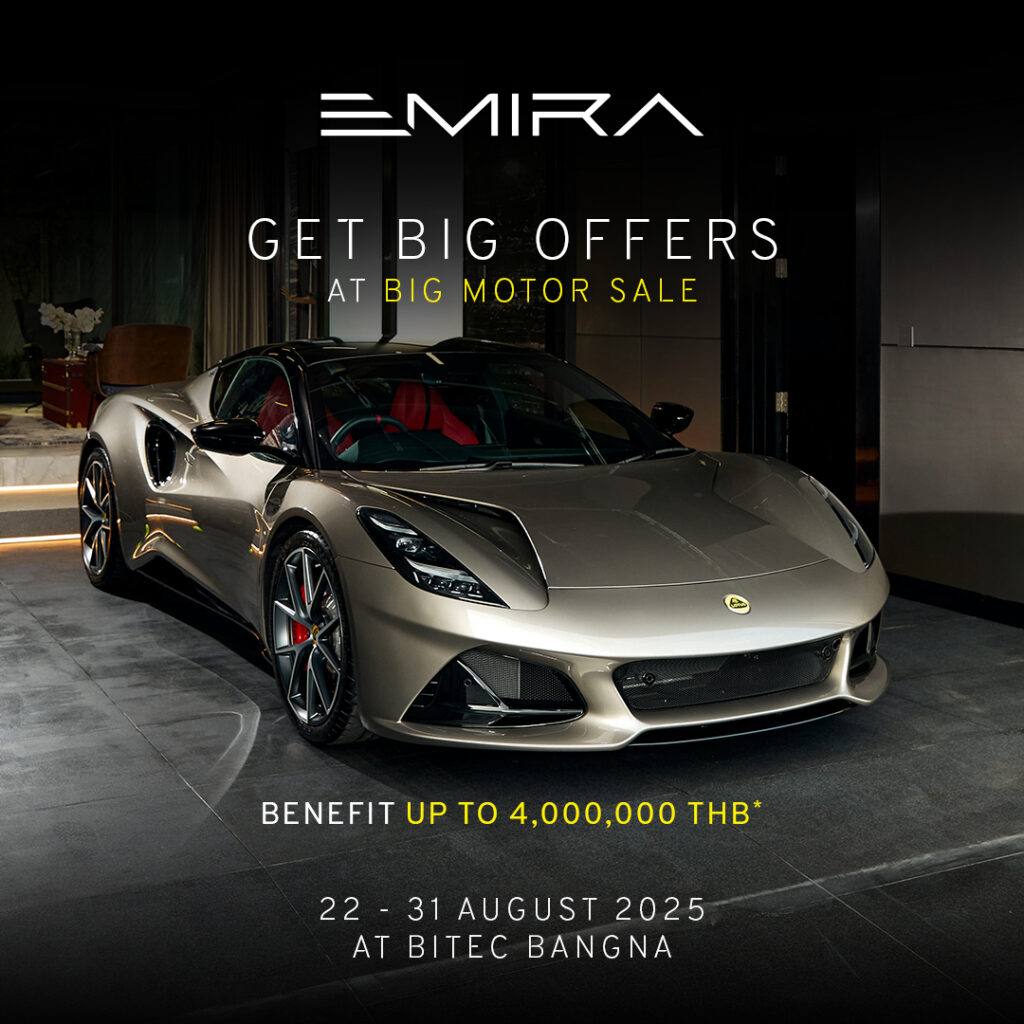 ตอกย้ำ คอนเซปต์ ‘Lotus For Everyone’ ที่ทุกท่านสามารถเป็นเจ้าของรถยนต์โลตัสได้แล้ววันนี้ มอบสิทธิพิเศษเฉพาะงาน Big Motor Sale 2025 ด้วยข้อเสนอพิเศษมูลค่าสูงสุด 4 ล้านบาท* สำหรับรถสปอร์ต อย่าง Lotus Emira First Edition V6 พร้อมเปิดจองในราคาที่ดีที่สุดแห่งปี เพียง 8.99 ล้านบาท* ด้วยเครื่องยนต์เบนซิน V6 ขนาด 3.5 ลิตร ซูเปอร์ชาร์จ (Supercharged) รุ่นพิเศษที่คุ้มค่าแก่การครอบครอง และ Lotus Emira First Edition i4 เครื่องยนต์ 2.0 ลิตร เทอร์โบ (I4) เปิดจองราคาพิเศษที่ไม่เคยมีมาก่อน เพียง 7.99 ล้านบาท* มาพร้อมเกียร์ 8 Speed dual clutch พร้อมพวงมาลัยแบบไฮดรอลิก ตอบสนองการขับขี่ได้อย่างแม่นยำ