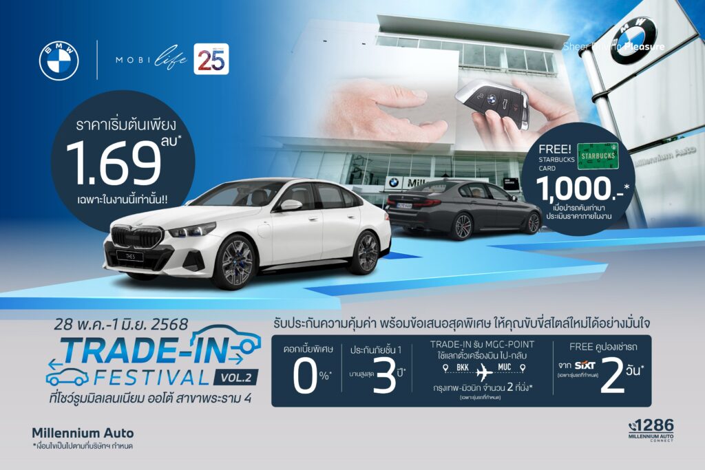 บีเอ็มดับเบิลยู มิลเลนเนียม ออโต้ ผู้แทนจำหน่ายรถยนต์ บีเอ็มดับเบิลยู อย่างเป็นทางการในประเทศไทย ผนึกกำลัง มาสเตอร์ เซอร์ทิฟายด์ ยูสคาร์ ศูนย์รวมรถยนต์มือสองครบวงจร ภายใต้บริษัท มิลเลนเนียม กรุ๊ป คอร์ปอเรชั่น (เอเชีย) จำกัด (มหาชน) จัดงาน ‘TRADE-IN FESTIVAL VOL.2’ หลังกระแสตอบรับดีเกินคาด พร้อมโปรโมชั่นเข้มข้นกว่าเดิม เพิ่มมูลค่ารถเทรด-อินสูงสุด พร้อมรับ MGC POINT สูงสุด เพื่อแลกรับ ตั๋วเครื่องบิน ไป-กลับ กรุงเทพ-มิวนิก จำนวน 2 ที่นั่ง* วันนี้ ถึง 1 มิถุนายน 2568 ที่โชว์รูม บีเอ็มดับเบิลยู มิลเลนเนียม ออโต้ พระราม 4