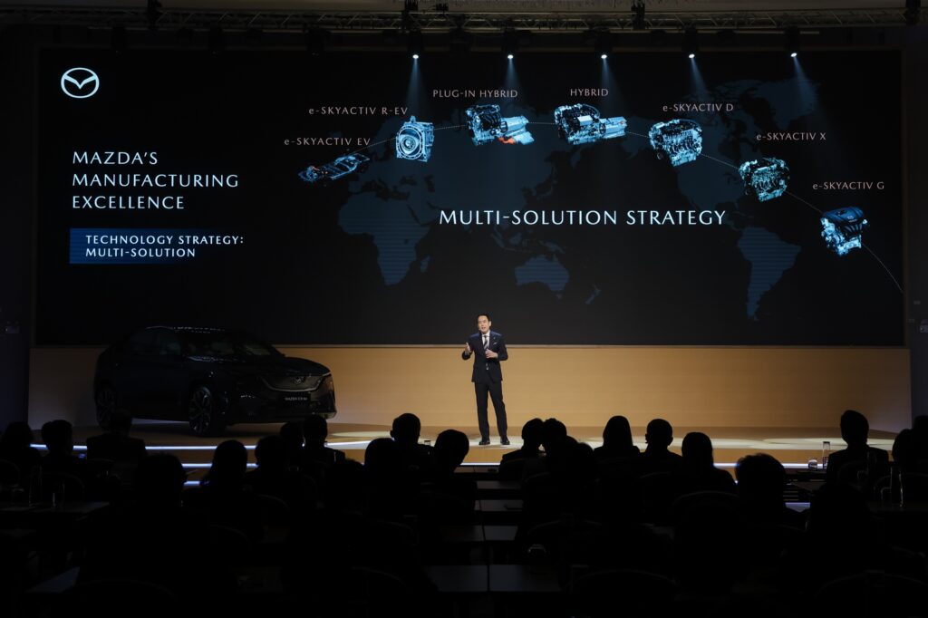 - การพัฒนาความเป็นเลิศด้านการผลิตและการพัฒนาอย่างต่อเนื่อง เพื่อส่งมอบผลิตภัณฑ์และเทคโนโลยีที่เป็นเอกลักษณ์ของมาสด้าให้กับลูกค้าได้อย่างต่อเนื่องและยั่งยืน ถึงแม้ว่ามาสด้าจะก้าวเข้าสู่ยุคของพลังงานไฟฟ้า แต่มาสด้าจะยังคงยึดมั่นในเอกลักษณ์ของตนเองไม่เปลี่ยนแปลง ด้วยแนวคิด “Multi-Solution Strategy” และ “Electrification with Mazda-ness” พร้อมกับพัฒนาผลิตภัณฑ์ของมาสด้าให้มีศักยภาพทางการแข่งขันด้วยการนำเทคโนโลยีดิจิทัลมาใช้อย่างจริงจัง ควบคู่กับการใช้กลยุทธ์ Model Based Development และ Monozukuri 2.0