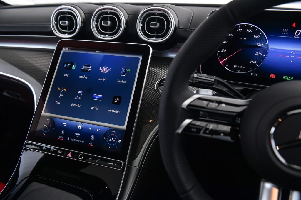 C 350 e AMG Dynamic (Night Edition) มาพร้อมการตกแต่งห้องโดยสารภายในแบบ AMG interior package โดดเด่นด้วยหน้าจอขนาด 12.3 นิ้ว บริเวณด้านหน้าของผู้ขับขี่ และหน้าจอเครื่องเล่นขนาด 11.9 นิ้ว ที่รองรับ Apple CarPlay® และ Android Auto ช่วยให้ผู้ขับขี่และผู้โดยสารสามารถเชื่อมต่อโลกดิจิทัลได้ทุกช่วงเวลา พร้อมเสริมความสะดวกสบายด้วยการติดตั้งกระจกหน้าต่างแบบ Heat and noise-insulting acoustic glass ช่วยป้องกันรังสีอินฟาเรด และเสียงสะท้อนจากภายนอก ระบบฟอกอากาศแบบ ENERGIZING AIR CONTROL และ MBUX augmented reality for navigation ช่วยให้ผู้ขับขี่ค้นหาสถานที่และนําทางได้อย่างมีประสิทธิภาพมากขึ้น