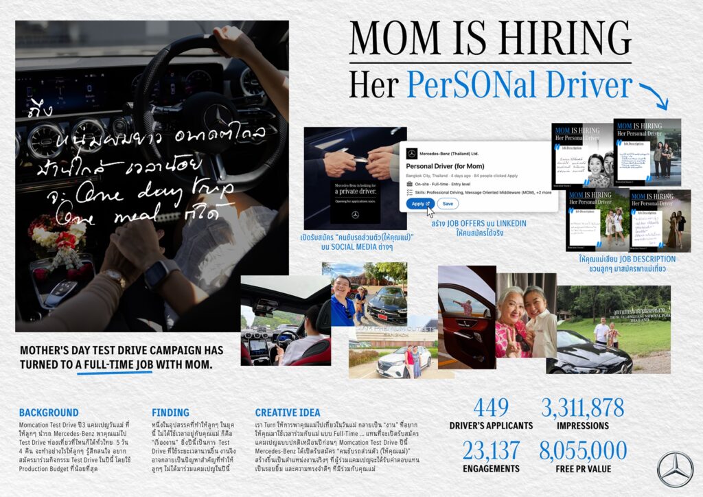 รายละเอียดแคมเปญ: ในช่วงเทศกาลวันแม่ เมอร์เซเดส-เบนซ์ ประเทศไทย ได้เปิดรับสมัครงานตำแหน่ง “คนขับรถส่วนตัว (ให้คุณแม่)” ในแพลตฟอร์มออนไลน์ของแบรนด์ โดยเป็นกิจกรรมภายใต้แคมเปญ “Momcation Test Drive” ที่จัดต่อเนื่องเป็นปีที่ 3 เพื่อสร้างช่วงเวลาที่มีคุณภาพระหว่างลูกๆ และคุณแม่ โดยล่าสุดมาในธีม “Let me be your Personal Driver” และชวนลูกๆ ที่มีใบขับขี่และรู้ว่าคุณแม่อยากจะไปเที่ยวที่ไหน สามารถที่จะพาคุณแม่ไปเที่ยวที่ไหนก็ได้ ด้วยรถยนต์เมอร์เซเดส-เบนซ์ ที่เตรียมพร้อมไว้ให้สำหรับทริปสุดพิเศษ ตลอด 5 วัน 4 คืน