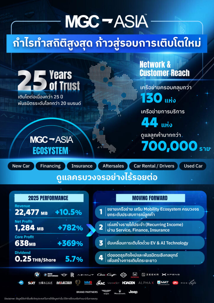 บริษัท มิลเลนเนียม กรุ๊ป คอร์ปอเรชั่น (เอเชีย) จำกัด (มหาชน) หรือ MGC-ASIA แถลงผลการดำเนินงานปี 2568 เติบโตโดดเด่น ทำสถิติกำไรสูงสุดใหม่ สะท้อนความแข็งแกร่งของโครงสร้างธุรกิจในระบบนิเวศ Mobility Ecosystem เชื่อมโยงตั้งแต่การจำหน่ายยานยนต์พรีเมียม รถยนต์ไฟฟ้า ธุรกิจการเงิน ประกันภัย บริการหลังการขาย และรถเช่า ช่วยสร้างรายได้ประจำที่เพิ่มขึ้นอย่างต่อเนื่อง ส่งผลให้บริษัทมีฐานกำไรที่แข็งแรงและเสถียรภาพสูงทั้งยอดขายยานยนต์พรีเมียม การเติบโตของตลาดรถยนต์ไฟฟ้า รายได้ประจำจากบริการ (Recurring Income) การฟื้นตัวของธุรกิจการเงินและประกันภัย ส่งผลให้อัตรากำไรและกระแสเงินสดของกลุ่มปรับตัวดีขึ้นอย่างมีนัยสำคัญ ยึดหลักการมีลูกค้าเป็นศูนย์กลาง โดยปีนี้เป็นการเริ่มบันทึกหน้าใหม่ เพื่อก้าวเข้าสู่การดำเนินธุรกิจยุคอนาคต