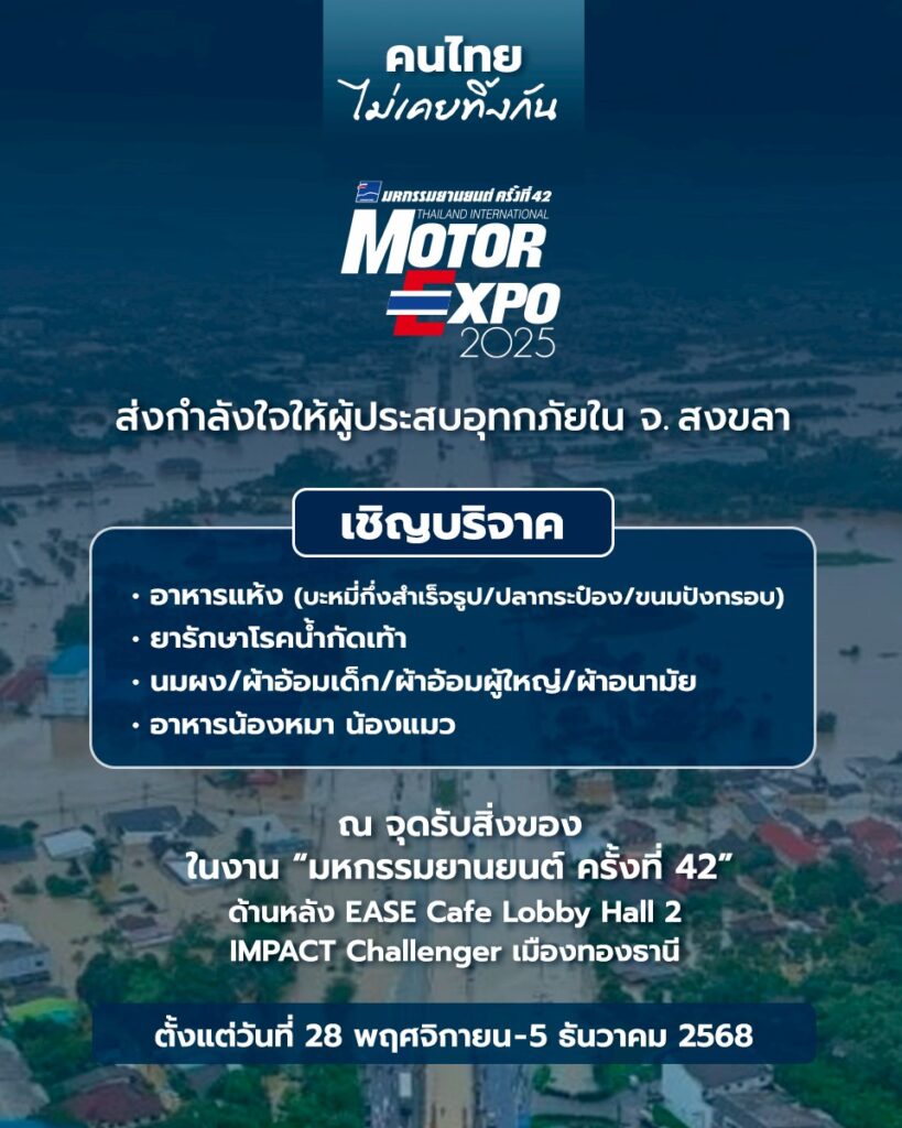 “IMC สื่อสากล” ผู้จัดงาน “มหกรรมยานยนต์” หรือ Motor Expo 2025 เปิดให้ผู้ชมงาน และประชาชนทั่วไปนำอาหารแห้ง สิ่งของเครื่องใช้มาบริจาค ภายในงาน “มหกรรมยานยนต์ ครั้งที่ 42” เพื่อรวบรวมส่งผ่าน Thai PBS ไปช่วยผู้ประสบภัยน้ำท่วมภาคใต้