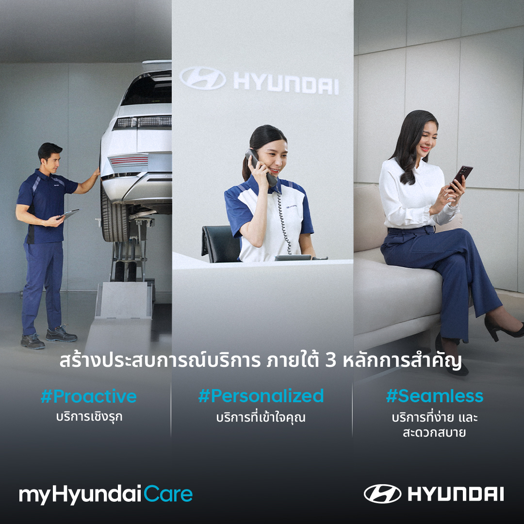 myHyundaiCare ขับเคลื่อนด้วย 3 แนวคิดหลัก ที่มุ่งสร้างประสบการณ์บริการที่เหนือกว่าในทุกมิติ โดยยึดหลักการให้บริการ 3 ด้านสำคัญ ดังนี้ #Proactive บริการเชิงรุก ที่ให้ความสำคัญกับการบำรุงรักษาเชิงป้องกัน ผ่านระบบ GDS (Global Diagnostic System) เพื่อตรวจสอบสภาพและวิเคราะห์ปัญหาอย่างแม่นยำ พร้อมกิจกรรมศูนย์บริการเคลื่อนที่ (Before Service – Outreach Activity) ที่นำทีมช่างผู้เชี่ยวชาญลงพื้นที่ให้บริการถึงจังหวัดต่าง ๆ ทั่วประเทศ, #Personalized – บริการที่เข้าใจคุณ ตอบโจทย์ทุกไลฟ์สไตล์ ผ่านโปรแกรมเฉพาะบุคคล เช่น IONIQ Premium Care สำหรับเจ้าของรถยนต์ไฟฟ้า และ EV Special Care โปรแกรมตรวจเช็กเฉพาะทางสำหรับรถ EV รวมถึงบริการเช็กระยะนอกสถานที่ (Mobile Service) ที่มอบความสะดวกสบายด้วยการตรวจเช็กและซ่อมนอกสถานที่อย่างครบวงจร และ #Seamless – บริการที่ง่ายและสะดวกสบาย ตั้งแต่การจองคิวออนไลน์ การติดตามสถานะบริการแบบเรียลไทม์ ไปจนถึงการเชื่อมโยงข้อมูลกับศูนย์บริการทั่วประเทศเพื่อมอบประสบการณ์ที่ไร้รอยต่อทุกขั้นตอน