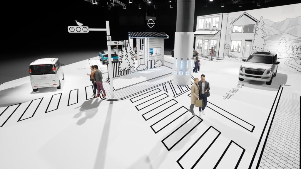 บูธได้รับแรงบันดาลใจจากวัฒนธรรมมังงะอันเป็นเอกลักษณ์ของญี่ปุ่น ด้วยโทนสีขาวดำอันโดดเด่น สะท้อนถึงแนวคิดที่หล่อหลอมจินตนาการระดับโลก ไม่ใช่แค่การเลือกสรรดีไซน์ แต่เป็นสะพานเชื่อมวัฒนธรรมที่เชื่อมโยงมรดกของนิสสันเข้ากับวิสัยทัศน์แห่งอนาคต สุนทรียศาสตร์ของมังงะกลายเป็นผืนผ้าใบสำหรับการเล่าเรื่อง และเชื้อเชิญให้ผู้เข้าชมสำรวจเส้นทางที่บรรจบกันระหว่างประเพณี และการเปลี่ยนแปลงที่จะเกิดขึ้น