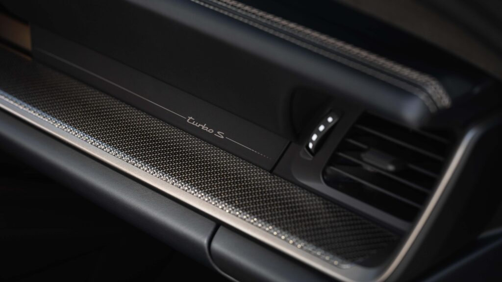 ปอร์เช่ยังติดตั้งไฟหน้า HD Matrix LED เป็นอุปกรณ์มาตรฐาน พร้อมฟังก์ชันไฟส่องสว่างอัจฉริยะที่ช่วยเพิ่มความปลอดภัยเมื่อต้องขับขี่ในเวลากลางคืน รวมไปถึง Sport Chrono Package พร้อมมาตรวัดอุณหภูมิยาง ระบบช่วงล่าง PASM ปรับเฉพาะรุ่น ระบบควบคุมการโคลงไฟฟ้า–ไฮดรอลิก PDCC และท่อไอเสียสปอร์ตไทเทเนียม เป็นอุปกรณ์มาตรฐาน และภายในมีการติดตั้งเบาะ Sport Seats Plus แบบปรับไฟฟ้า 18 ทิศทางพร้อมฟังก์ชันจำตำแหน่ง และตัวอักษร “Turbo S” บนพนักพิงศีรษะที่เป็นมาตรฐานจากโรงงาน และลายปั๊มนูน Turbo S บนเบาะและแผงประตู ที่ได้รับแรงบันดาลใจจากดีไซน์ของ 911 Turbo 930 รุ่นแรก ทั้งยังมีเบาะสปอร์ตน้ำหนักเบาแบบพับได้ที่คุ้นเคยมาจาก 911 GT3 ให้เลือกเป็นออปชันสำหรับรุ่นคูเป้