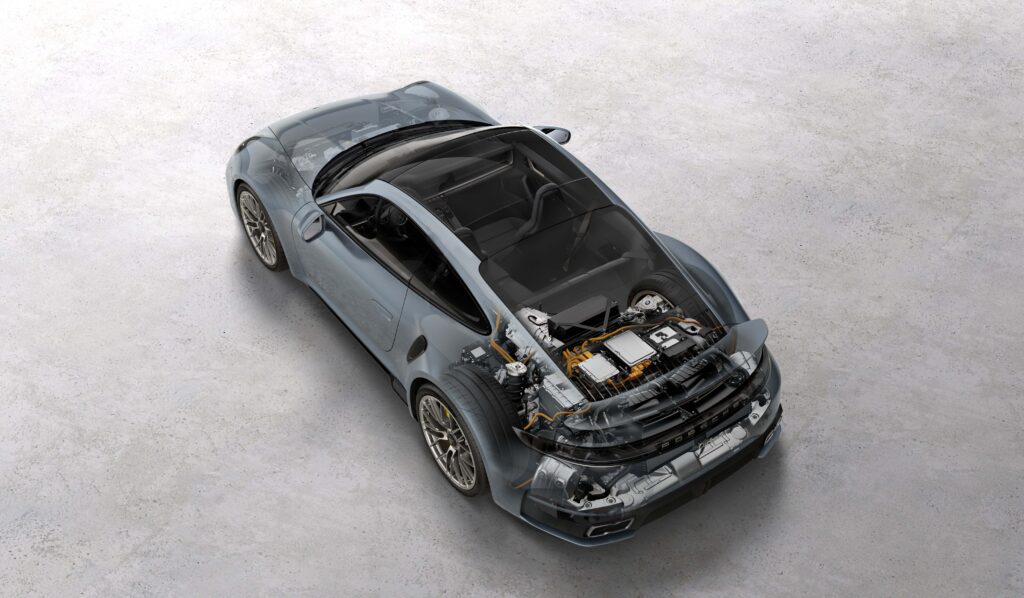 ขุมพลังสมรรถนะสูงที่ี่พัฒนาขึ้นมาใหม่ให้กำลังรวม 523 กิโลวัตต์ (711 แรงม้า) ทำให้ 911 เทอร์โบ เอส ใหม่ กลายเป็นยนตรกรรมในตระกูล 911 ที่ทรงพลังที่สุดเท่าที่เคยมีมา ด้วยแรงบิดสูงสุด 800 นิวตันเมตร ซึ่งพร้อมใช้งานในช่วงรอบเครื่องกว้างตั้งแต่ 2,300 – 6,000 รอบต่อนาที และยังมีจุดพีคกำลังที่ต่อเนื่องเป็นพิเศษระหว่าง 6,500 – 7,000 รอบต่อนาที ทำให้ผู้ขับขี่สามารถเรียกใช้พลังสูงสุด 711 แรงม้าได้เต็มประสิทธิภาพ ทั้งยังขับเคลื่อนด้วยเทคโนโลยี T-Hybrid น้ำหนักเบา 400 โวลต์ ซึ่งทำให้มีกำลังเพิ่มขึ้น 61 แรงม้าเมื่อเทียบกับรุ่นก่อนหน้า โดยเทคโนโลยี T-Hybrid เปิดตัวครั้งแรกจาก 911 คาร์เรร่า จีทีเอส (911 Carrera GTS) ปี 2024 และพัฒนาต่อยอดมาจนถึงใน 911 เทอร์โบ เอส ใหม่ โดยใน จีทีเอส (GTS) ใช้ เทอร์โบไฟฟ้า (eTurbo) เพียงตัวเดียว แต่สำหรับ 911 เทอร์โบ เอส ใหม่ นี้ถูกติดตั้ง eTurbo คู่ โดยใบพัดและคอมเพรสเซอร์ได้รับการออกแบบเฉพาะเพื่อตอบโจทย์สำหรับรุ่นสูงสุด ซึ่งทั้งสองตัวจะช่วยเพิ่มสมรรถนะและการตอบสนองของระบบขับเคลื่อนได้อีกด้วย ทั้งยังมีแบตเตอรี่แรงดันสูงน้ำหนักเบา พร้อมความจุ 1.9 กิโลวัตต์ชั่วโมง เหมือนกับใน 911 คาร์เรร่า จีทีเอส โดยทำงานร่วมกับเกียร์ PDK 8 สปีดที่มาพร้อมมอเตอร์ไฟฟ้า ส่งกำลังสู่ระบบขับเคลื่อนสี่ล้อ Porsche Traction Management (PTM) ผลลัพธ์คือ 911 เทอร์โบ เอส คูเป้ (911 Turbo S Coupé) รุ่นใหม่นี้ ทำเวลา 0-100 กม./ชม. ได้ใน 2.5 วินาที โดยเร็วกว่ารุ่นก่อน 0.2 วินาที และใช้เวลาเพียง 8.4 วินาที ถึง 200 กม./ชม. ซึ่งเร็วกว่ารุ่นก่อนหน้า 0.5 วินาที และสามารถทำความเร็วสูงสุดได้ถึง 322 กม./ชม.
