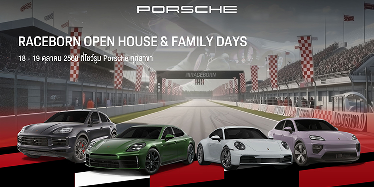 เตรียมพบกับงาน Raceborn Open House & Family Days ซึ่งจัดขึ้นโดยปอร์เช่ ประเทศไทย ระหว่างวันที่ 18 – 19 ตุลาคม 2568 ณ โชว์รูมปอร์เช่อย่างเป็นทางการพร้อมกันทุกแห่ง เตรียมมอบประสบการณ์สุดพิเศษให้แก่ผู้ชื่นชอบและผู้ที่สนใจในยนตรกรรมปอร์เช่ ภายในงานจะได้พบกับ การจัดแสดงยนตรกรรมสปอร์ตหลากหลายรุ่นในลวดลายรถแข่งในตำนาน และสำหรับผู้ที่เข้าร่วมการทดลองขับภายในงานจะได้ทดลองขับร่วมกับนักแข่งมืออาชีพและผู้เชี่ยวชาญด้านการขับขี่ที่ได้รับการรับรองจากปอร์เช่ นอกจากนี้ผู้ที่จองและรับรถในช่วงเวลาที่กำหนดจะได้ลุ้นรับแพ็คเกจร่วมขับรถสุดเอ็กซ์คลูซีฟ ณ Porsche Experience Centre กรุงโตเกียว ประเทศญี่ปุ่น* และรับข้อเสนอพิเศษแห่งปีสำหรับรุ่นมาคันน์, ไทคานน์, คาเยนน์ และพานาเมรา รวมมูลค่าสูงสุดกว่า 1 ล้านบาท สำหรับผู้ที่จองและรับมอบรถยนต์ภายใน 31 ตุลาคม 2568 เท่านั้น*