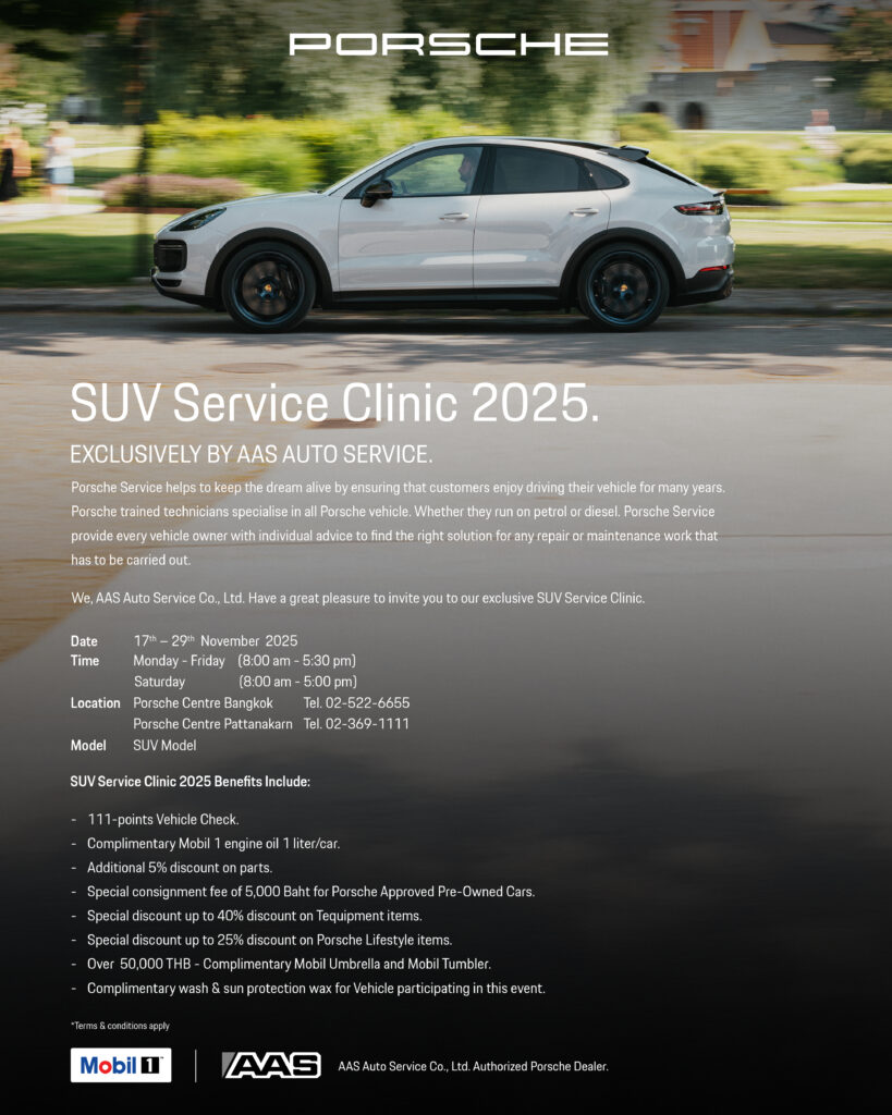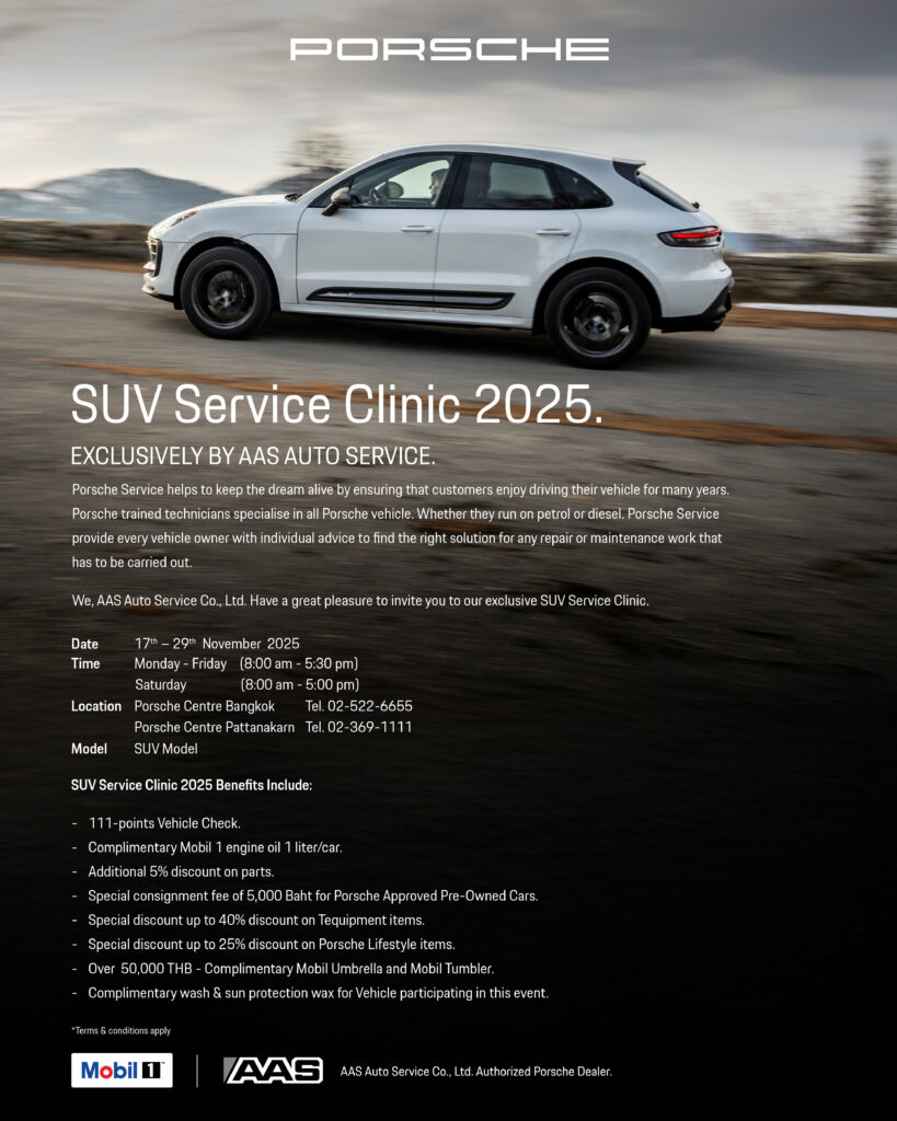 แคมเปญพิเศษ “Porsche SUV Service Clinic 2025” จัดขึ้นระหว่างวันที่ 17 – 29 พฤศจิกายน 2568 ณ Porsche Centre Bangkok และ Porsche Centre Pattanakarn โดยมุ่งเน้นการดูแลรถยนต์ปอร์เช่ในกลุ่ม SUV อย่างละเอียดครบถ้วน ภายใต้แนวคิด ‘AAS Looking After YOU and Your Car’ เพื่อมอบความอุ่นใจและความมั่นใจให้แก่สมาชิกครอบครัวเอเอเอสฯ ทุกท่านในทุกการเดินทาง