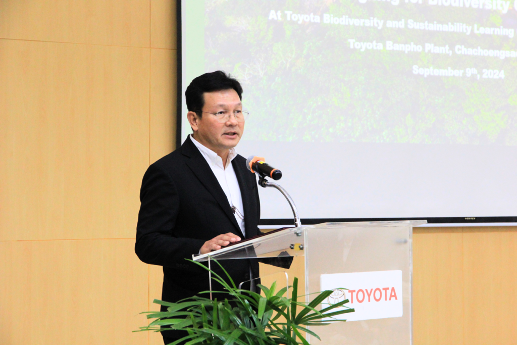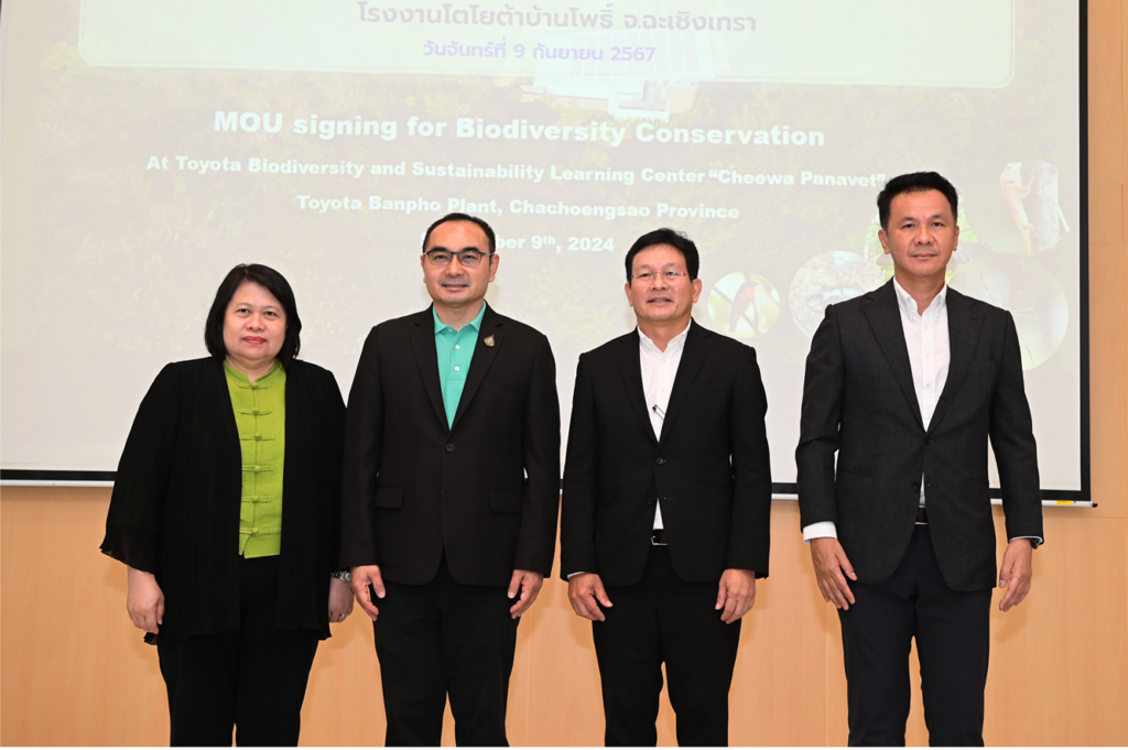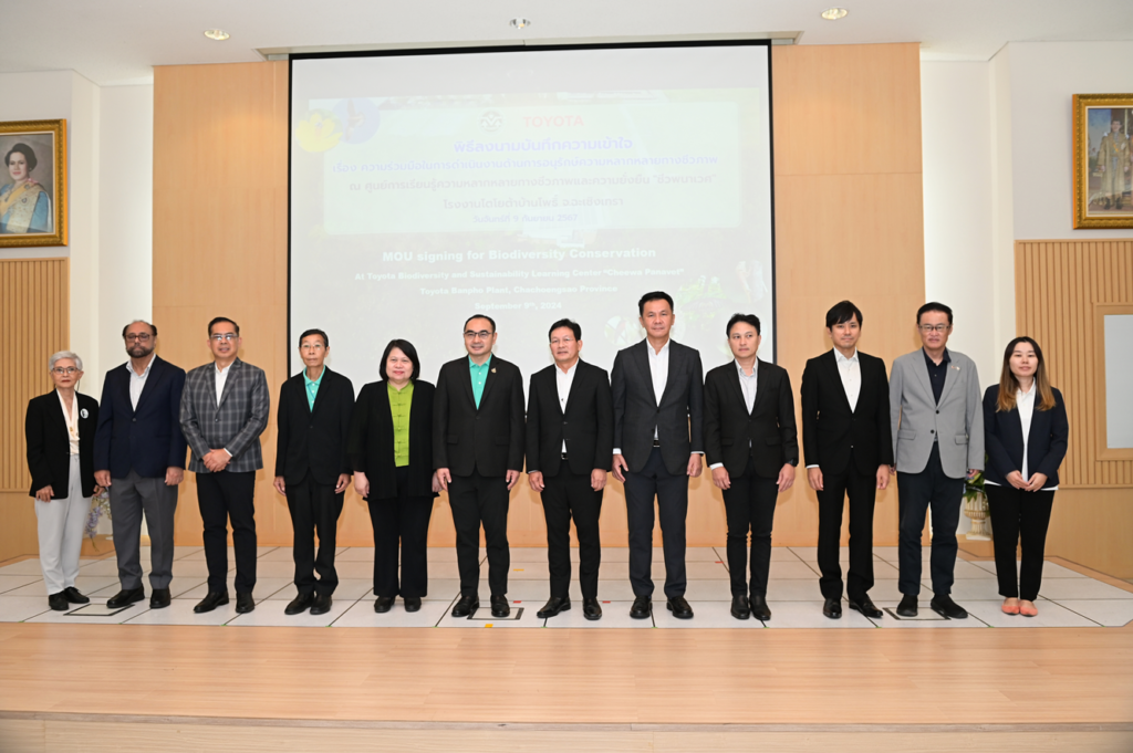 นายสุวิทย์ ไชยประสิทธิ์ ผู้ช่วยกรรมการผู้จัดการใหญ่ บริษัท โตโยต้า มอเตอร์ ประเทศไทย จำกัด และนายประเสริฐ ศิรินภาพร เลขาธิการ สำนักงานนโยบายและแผนทรัพยากรธรรมชาติและสิ่งแวดล้อม (สผ.) ร่วมลงนามในบันทึกความเข้าใจ (MOU) เพื่อร่วมมือในการดำเนินงานด้านการอนุรักษ์ความหลากหลายทางชีวภาพ ยกระดับพื้นที่ศูนย์การเรียนรู้ความหลากหลายทางชีวภาพและความยั่งยืน “ชีวพนาเวศ”ภายในโรงงานโตโยต้าบ้านโพธิ์ สู่การเป็นต้นแบบ “พื้นที่อนุรักษ์ความหลากหลายทางชีวภาพนอกเขตพื้นที่คุ้มครอง (OECMs)” ที่จัดการโดยเอกชน โดยมี มร. ทัตสึชิ นิชิโอะกะ อัครราชทูต ประจำสถานเอกอัครราชทูตญี่ปุ่น ประจำประเทศไทย ร่วมเป็นสักขีพยาน ณ โรงงานโตโยต้า บ้านโพธิ์ จ.ฉะเชิงเทรา เมื่อวันที่ 9 กันยายน 2567 ที่ผ่านมา