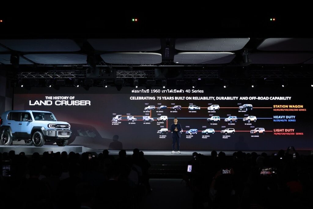 มร.โนริอากิ ยามาชิตะ กรรมการผู้จัดการใหญ่ บริษัท โตโยต้า มอเตอร์ ประเทศไทย จำกัด กล่าวถึงประวัติ และตำนานของ LAND CRUISER ว่า “กว่า 70 ปีที่ผ่านมา Toyota Land Cruiser ได้รับการยอมรับในฐานะแบรนด์ระดับตำนานที่เป็นสัญลักษณ์ของ ความแข็งแกร่ง ความทนทาน และความน่าเชื่อถือ ตำนานของ Land Cruiser เริ่มต้นขึ้นในปี 1951 ภายใต้ชื่อ “Toyota BJ” และได้รับการพัฒนาอย่างต่อเนื่องตลอดหลายทศวรรษที่ผ่านมา เพื่อรองรับการใช้งานที่หลากหลายของผู้คนทั่วโลก โดยปัจจุบัน Land Cruiser ได้เข้าไปเป็นส่วนหนึ่งของการเดินทาง และไลฟ์สไตล์ของผู้คนในกว่า 180 ประเทศ
