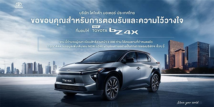 บริษัท โตโยต้า มอเตอร์ ประเทศไทย จำกัด ขอขอบคุณสำหรับการตอบรับและความไว้วางใจ ที่มอบให้ NEW TOYOTA bZ4X ซึ่งล่าสุดเมื่อวันที่ 29 กันยายน 2568 ทางโตโยต้าได้รับยอดผู้ลงทะเบียนสิทธิ์ล่วงหน้าครบตามจำนวน 2,000 ท่าน เป็นที่เรียบร้อยแล้ว