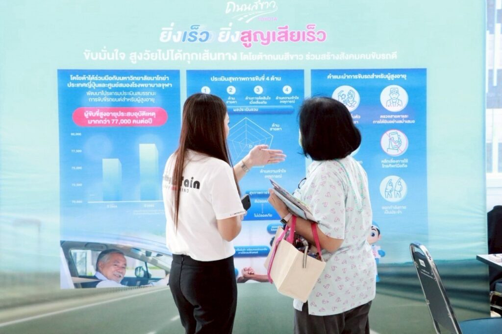 โตโยต้าดำเนินกิจกรรมด้านความปลอดภัยทางถนน ภายใต้โครงการโตโยต้า ถนนสีขาว อย่างต่อเนื่องมากว่า 37 ปี เพื่อสร้าง “สังคมคนขับรถดี (Good Driver Society)” แก่ประชาชนในทุกวัย โดยหนึ่งในนั้นคือการนำ “โปรแกรมประเมินสมรรถนะการขับขี่รถยนต์สำหรับผู้สูงอายุ” ที่ได้พัฒนาร่วมกับมหาวิทยาลัยนาโกย่า ประเทศญี่ปุ่น ซึ่งเน้นประเมินสุขภาพใน 4 ด้าน ได้แก่ พลังร่างกาย สายตา การตัดสินใจ และความเข้าใจเหตุการณ์ มาใช้กับประเทศไทย ซึ่งกำลังก้าวเข้าสู่สังคมผู้สูงอายุอย่างสมบูรณ์